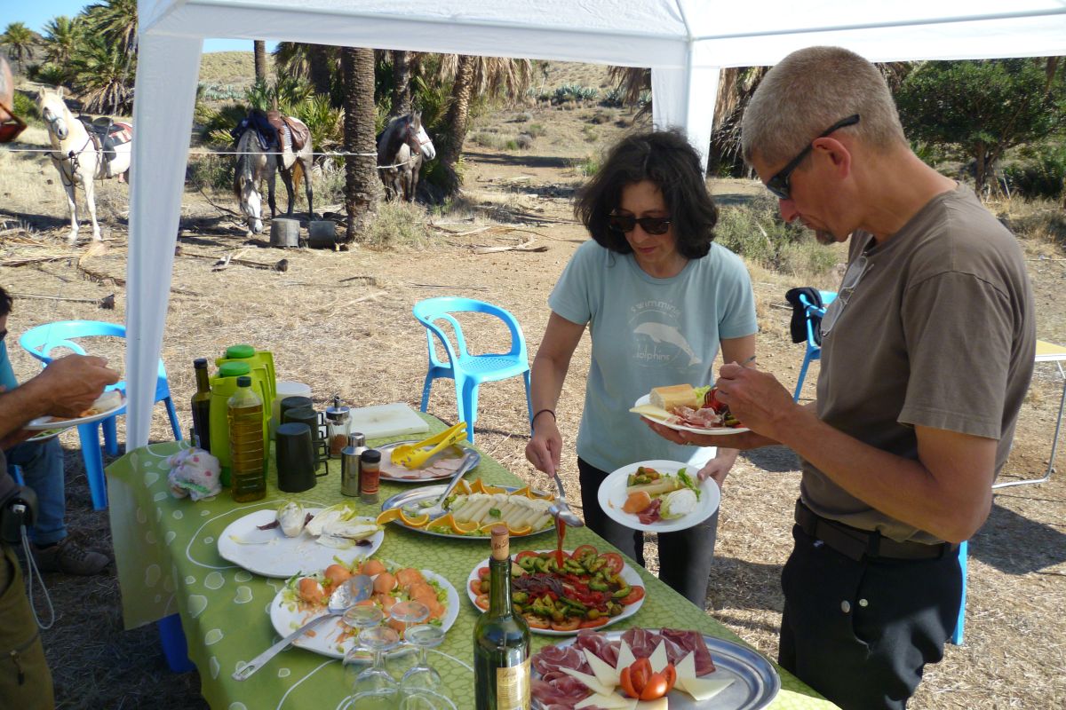 Aber zurück zu unserem Trail: Der letzte Reittag startet durch ein überraschend grünes Tal, gespickt von grünen harten Büscheln, deren Halme selbst die Pferde nicht abbeißen - sie abzureißen ist ganz unmöglich. Nur die paar Ähren, die gelegentlich daraus hervor sprießen, sind wohl genießbar. Bald folgen wir einem kaum erkennbaren Pfad bergauf und oben an der Kuppe wird der Blick frei auf das tiefblaue Mittelmeer. Mit diesem tollen Panorama geht es nun immer wieder ein Stück landeinwärts und dann wieder Richtung Meer. Eine versteckte Bucht bietet eine besonders schöne Kulisse für ein paar Erinnerungsfotos. Weiter geht es zu einem Aussichtspunkt und hinab in eine kleine Palmenoase zum nächsten Strand. Nun ist die Küste flacher und ein langer Sandstrand zieht sich über einige Kilometer bis zu einer alten Burgfeste. Wir durchqueren ein Fischerdorf und reiten hinauf zu einer Ruine, an der wir mit Blick auf Berge und Meer unser Mittagessen sowie die obligatorische Siesta genießen. Das Mittagessen wird dabei stets am Tisch eingenommen und wird von einem Restaurant für uns zubereitet, es ist jedes Mal vorzüglich. Nach der Siesta unter andalusischer Sonne und mit gelegentlichem Anstupsen von Annas lustigen Hunden, nehmen wir unsere letzte Etappe. Zunächst erwarten uns auf dem breiten Küstenweg noch ein paar muntere Galoppaden, die Antonio mit seinem Handy festhält. Dann wird der Weg erst felsiger und später recht schmal und so genießen wir in ruhigem Tempo den Blick über die Steilküste. Bals entdecken wir San José, wo unser Ausgangshotel liegt. Idyllisch zwischen den Bergen liegt es an der Küste mit seinen schneeweißen Häusern. Die Pferdekoppeln befinden sich nach dem Ortsausgang in der Ebene. Ein schmaler Pfad führt geradewegs hinunter zum Hof. Und schon heißt es absteigen und Abschied nehmen. Nachdem alle Pferde gut versorgt und verabschiedet sind, gibt es noch einen Aperitif und ein paar nette Gespräche bevor wir zum Hotel fahren.