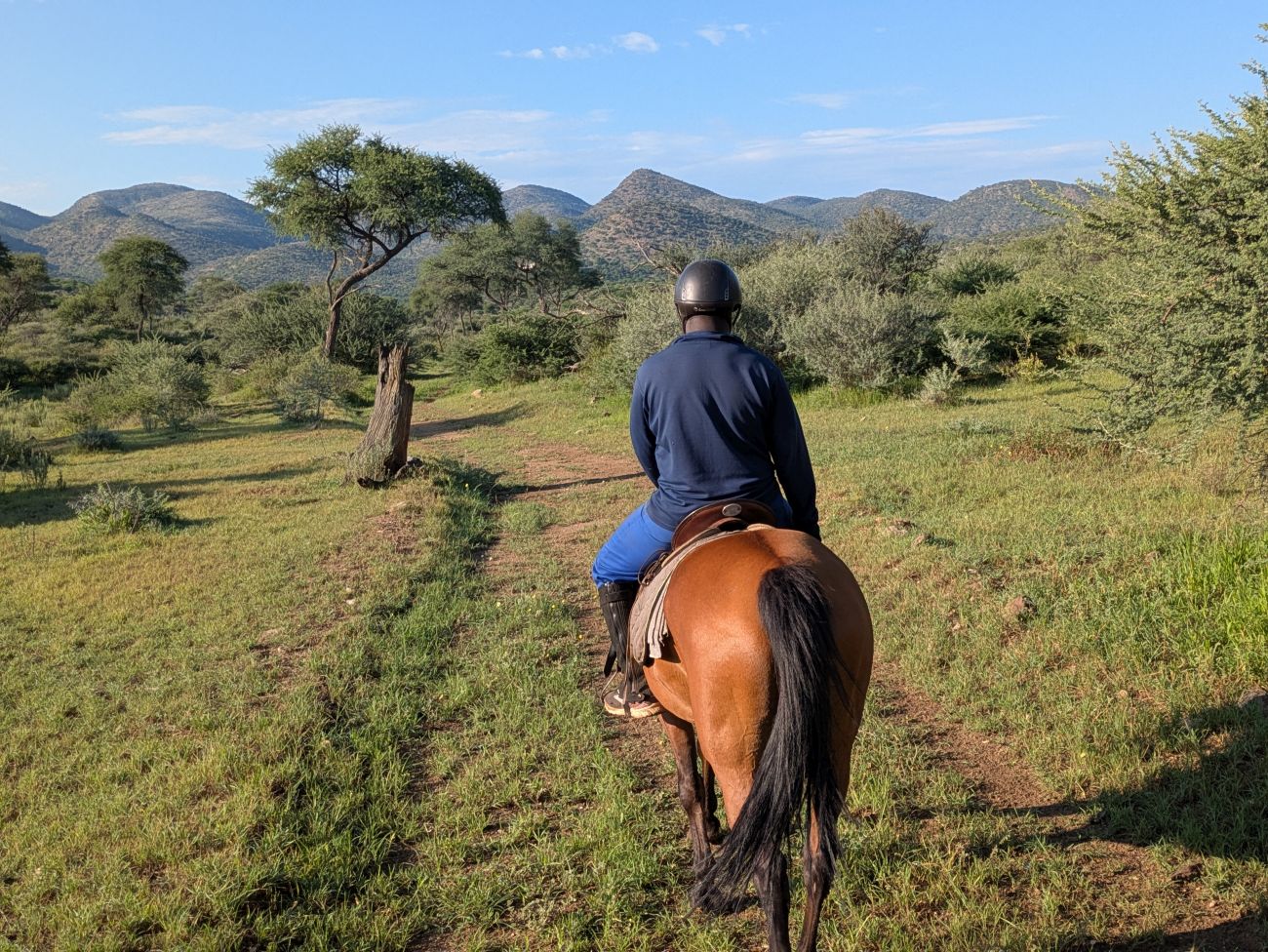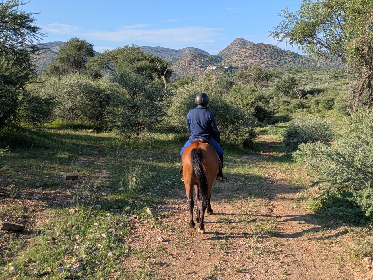 2. Tag: Vor dem Frühstück treffen Sie sich um 7.00 am Stall bei den fertig gesattelten Pferden und dann geht es schon auf einen Ausritt um Wildtiere aufzuspüren, denn die sind um diese Zeit besonders aktiv. Nach 1- 2 Stunden Ausritt sind Sie rechtzeitig zurück zum Frühstück. Danach können Sie sich am Pool entspannen. Am Nachmittag geht es auf einen Gamedrive ins Hochland, bei dem bestimmt einige Antilopen, Giraffen und Zebras anzutreffen sind. Anschliessend finden sich alle zum Dinner wieder ein.