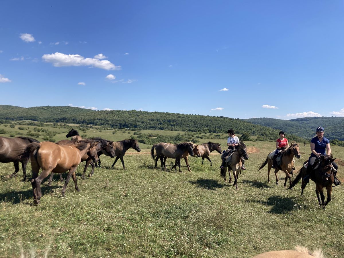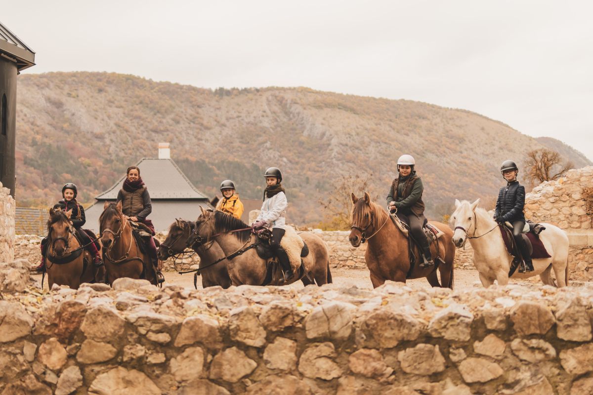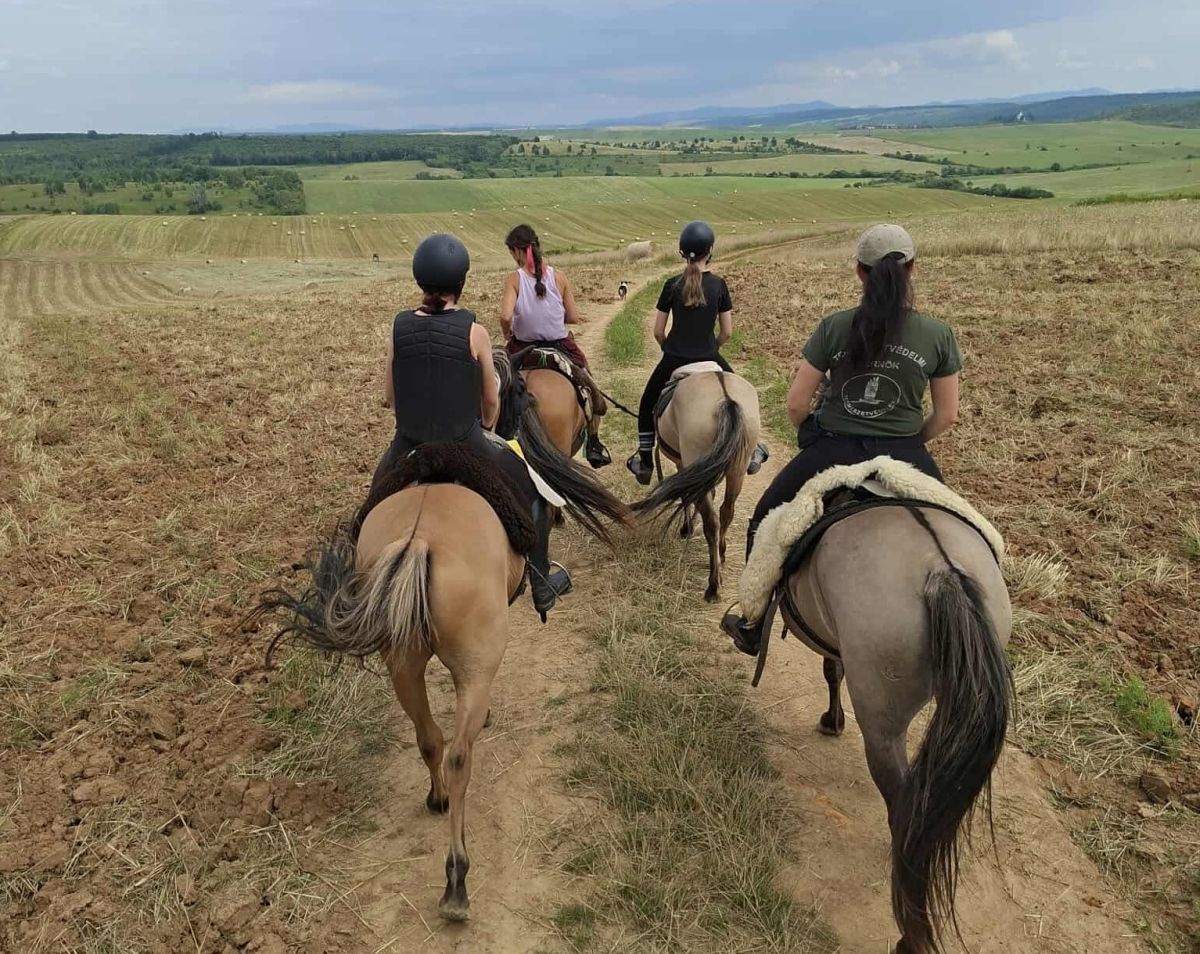 Pferde: Sie reiten Kunfakó-Pferde (ähnlich wie Huzulen). Die meisten von ihnen werden auf der Farm geboren und aufgezogen und sind gut an das abwechslungsreiche Gelände der Region angepasst. Sie leben das ganze Jahr über in Herden auf grossen, offenen Weiden, was sie gesund und widerstandsfähig gegenüber allen Wetterbedingungen hält. Sie reiten sowohl Wallache als auch Stuten. Alle sind relativ klein, aber es sind starke Gebirgspferde mit einem freundlichen und sanften Charakter. Das macht sie sowohl für Kinder als auch für weniger erfahrene Reiter ideal. Stockmaß: 135–155 cm. Sattel & Zaum: Es werden hauptsächlich ungarische Holzsättel mit Schaffellbezügen, traditionelle lokale Wanderreit-Sättel und einige Westernsättel verwendet. Satteltaschen und Regenmäntel werden gestellt. Reiterfahrung: Reiter müssen sich in allen drei Gangarten sicher fühlen, auch auf verschiedenen Geländen. Auf einigen kurzen Strecken müssen die Pferde bergab geführt werden. Maximale Reitergewicht: 75 kg.