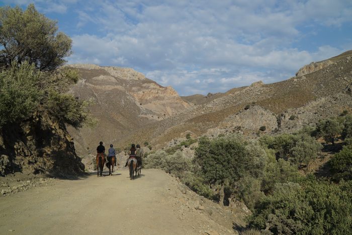 Programm Beispiel: 1. Tag: Ankunft in Heraklion und Transfer zum Hotel, ca. 1 Stunde. Wenn Sie früh genug anreisen, können Sie bereits die Pferde und anderen Hoftiere kennen lernen und einen kurzen Proberitt machen. 2. Tag: Nach einem ausgiebigen Frühstück machen Sie sich auf den Weg zum Stall, wo Sie Ihre Pferde satteln und in Richtung des Kofinas reiten. Bald geht es weiter landeinwärts über die Schaf- und Ziegenweiden mit Blick über die endlose Massara Ebene, hinter der sich Kretas höchster Berg erhebt - bis in den Frühsommer ist die Kuppe oft noch mit Schnee bedeckt! Unterwegs machen Sie eine ausgedehnte Lunchpause an einer hübschen Kapelle mit uralten Olivenbäumen. Noch zwei weitere Kapellen und einige minoische Ruinen werden Sie passieren. Auf dem Heimweg geniessen Sie das tolle Panorama von Bergen und Meer. Wer Lust hat, kann noch zu Fuss die Spitze des Kofinas erklimmen um einen noch besseren Ausblick zu haben. Reitzeit: 4-5 Stunden.3. Tag: Heute reiten Sie Richtung Westen zur Tripiti Schlucht. Die zweitgrösste Schlucht Kretas wurde nach einer Kirche in einer Höhle am Fusse des Canyons benannt, die nur auf unbefestigten Pfaden zu erreichen ist. An einem magischen Ort mit Kapelle und den Überresten einer minoischen Siedlung machen Sie eine Pause. Anschliessend geht es weiter sanft bergab durch Felsen, knorrige Oliven und karges Weideland mit Schafen und Ziegen, Meerblick stets inklusive. Der Ritt durch die Schlucht ist atemberaubend, rechts und links der schmalen Pfade türmen sich haushohe Felsen. Am Ende der Schlucht angekommen können Sie sich im Meer erfrischen. Mittagessen im Restaurant. Später geht es über eine ähnliche Route zurück zum Stall, wobei die sanft ansteigeneden, breiten Wege nun zum ein oder anderen Galopp einladen. Reitzeit: 5-6 Stunden. 4. Tag: Heute können Sie erst einmal ausschlafen und dann den Tag entweder für einen Ausflug z.B. an eine Bucht oder für eine Wanderung nutzen. Am Abend treffen Sie sich dann für einen Sonnenuntergangsritt am Stall. Über schmale Ziegenpfade geht es hinauf zu einem Aussichtspunkt mit grossartigem Blick auf die zerklüftete Küste im Abendrot. Anschliessend geniessen Sie wie gewohnt ein köstliches Abendessen im Hotelrestaurant. Reitzeit: max. 1,5 Stunden. 5. Tag: Heute starten Sie zu einem 2-Tages-Ritt zum Kloster von Koudoumas, wo auch heute noch Mönche leben und arbeiten. Es geht erneut in Richtung Osten, vorbei am Berg Kofinas, an dem Geier und Adler leben. Nun geht es stetig bergab über breite Pisten durch einen weiten Pinienwald mit Blick aufs Meer. Am Mittag machen Sie Rast an einer Kapelle oder im Wald und geniessen Ihr Picknick. Gegen Abend erreichen Sie das abgelegene Kloster am Meer, versorgen die Pferde und haben dort die Möglichkeit sich bei einem Bad im kühlen Nass zu erfrischen. Die Übernachtung findet in der einfachen Pension am Kloster statt. Wer möchte, kann aber auch in einem Schlafsack (wird gestellt) direkt am Strand übernachten. Reitzeit 5-6 Stunden.6. Tag: Sie frühstücken im Garten des Klosters, satteln die Pferde und machen sich auf den Weg nach Agios-Ioannis, unweit der antiken Ausgrabungsstätte von Phaistos. Ihr Weg führt sie oberhalb der Steilküste entlang über einen schmalen, teils felsigen Pfad, gesäumt von Bäumen. Einige Passagen müssen aufgrund der Bodenverhältnisse geführt werden. Dafür werden Sie mit atemberaubenden Ausblicken auf die zerklüftete Küste, Felsen und Höhlen belohnt. In Agios-Ioannis haben Sie die Möglichkeit im Meer zu schwimmen und stärken sich bei einem leckeren Lunch. Im Anschluss führt Sie ein breiter Weg in Serpentinen bis zum Dorf und zum Stall zurück, den Sie gegen Nachmittag erreichen. Reitzeit mind. 5 Stunden.7. Tag: Frühstück und Abreise gemäss Ihrer Flugzeiten. Wer erst am Abend abreist, kann auch am Vormittag noch einmal in den Sattel steigen. Je nach Wetter, Erfahrung und Wünschen können die Reihenfolge der Ritte und das genaue Programm abweichen, z.B. ist es möglich, den 2-Tages-Ritt statt zum Kloster zur Tripiti-Schlucht oder an eine Bucht im grüneren Osten zu organisieren. Kurzprogramm 4 Tage: 1.-3. Tag siehe oben. Am 4. Tag unternehmen Sie den Ritt zum Aussichtspunkt bereits nach dem Frühstück. Abreise nach dem Mittagessen. Wenn Sie am selben Tag zurückfliegen, am besten ab 17 Uhr.Nichtreiter/Ausflugstipps: Es gibt zahlreiche einsame Buchten, abgelegene Höhlen und Kapellen in der Umgebung, die einen Besuch wert sind. Ausserdem ist Kreta voll von minoischen Ruinen und Ausgrabungsstätten aus der Bronzezeit. Wer das Meer liebt, kann an einer der Buchten baden, schnorcheln oder eine Bootstour unternehmen. Auf Anfrage können Sie auch einen Kochkurs buchen oder beim Schafemelken und der Käseherstellung zusehen.
