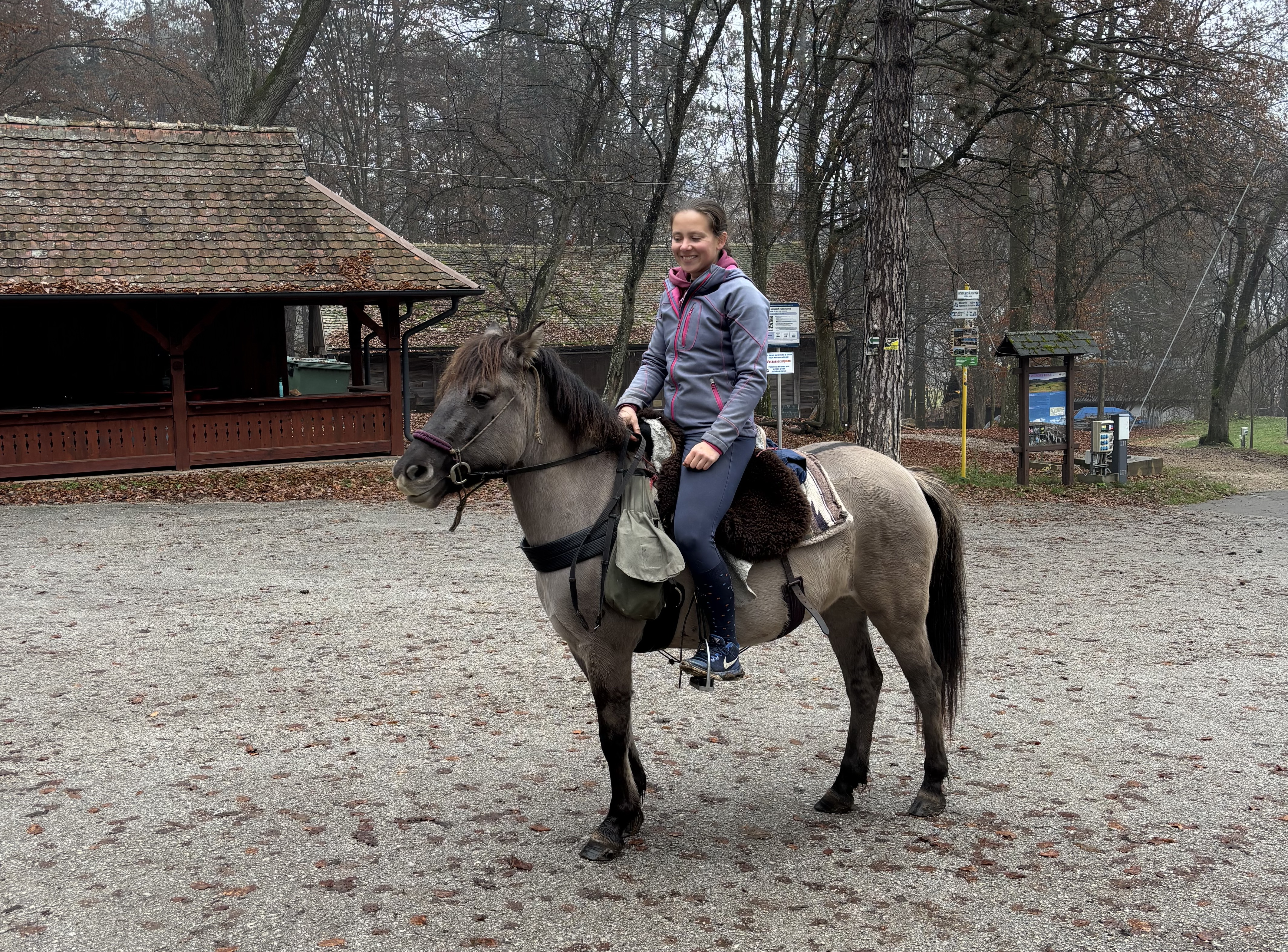 Das Wetter war alles andere als ideal, aber unser fröhlicher Guide Eszter sorgte für gute Stimmung. Sie erzählte uns voller Leidenschaft, wie sie in der Slowakei gelandet ist, angefangen hat, Kunfakos zu züchten, und Touren zu führen. Schon seit ihrer Kindheit ist sie begeistert vom Tourismus und ausgebildete Reitführerin. Die Berge hat sie immer geliebt – so ist sie im slowakisch-ungarischen Karst gelandet. Sie begann Kunfakos zu züchten, weil sie robust, freundlich und vielseitig sind. Kunfakos sind eine relativ neue ungarische Rasse, eine Mischung aus Polnischem Konik, Huzule und Araber. Ziel war ein einfach zu haltendes, ruhiges, langlebiges und kräftiges Reitpferd für lange Strecken. Kinder reiten sie oft, weil sie so brav sind, aber auch abenteuerlustige Reiter lieben sie. Im Sommer, erzählte sie, nimmt sie den jungen Murány als Packpferd, sattelt ein Pferd für sich, packt ihre zwei Hunde ein und ihren Sohn, festgebunden auf ihrem Rücken, und reitet von der Slowakei bis zur Donau – 50 km täglich, übernachtet wird dort, wo es dunkel wird: bei Freunden oder im Zelt.