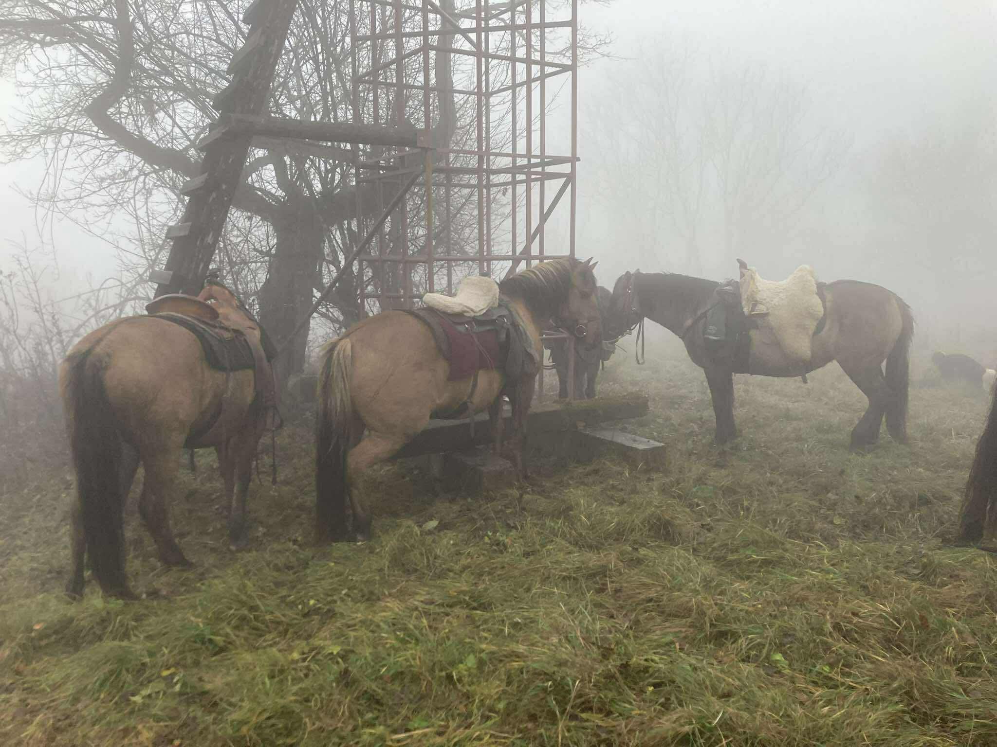 Wir kamen in Gombaszög an, und unser Guide Eszter wartete schon mit Frühstück und warmem Tee auf uns. Leider hatten wir dank unserer Snacks bereits einen Zuckerschock, also machten wir uns direkt auf zu den Pferden. Da es Ende der Saison war, standen die Pferde schon auf den Weiden – also war unsere erste Aufgabe des Tages, sie zu finden und einzusammeln. Mein Freund und ich sahen wohl am frischsten aus, also schickte uns Eszter los, alle Pferde zu holen. Er wurde in den Wald geschickt, um die Wallache zu suchen, und ich sollte mit meinen Mitreiterinnen die Stuten finden. Ich bekam sehr detaillierte Infos: „Die Pferde sind auf einem Feld hinter dem Haus.“ Tja… nur hat man wegen des Nebels kein einziges Haus gesehen.