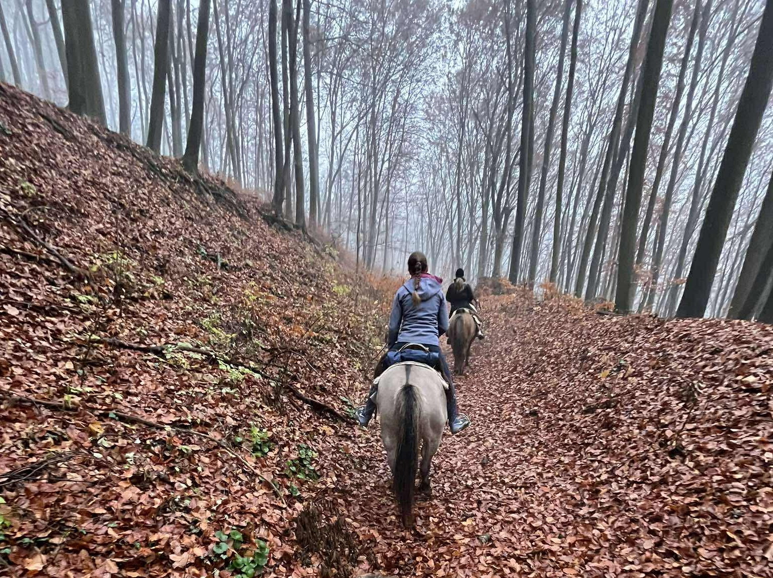 Als schließlich alle bereit waren, ritten wir los in den grauen Nebel. Wir waren sechs Reiter und zwei Hunde – Bojtár und Zsenge –, die uns treu begleiteten und unsere kleine Pferdeherde beschützten. Der Wald war still, nur wir und die Pferde an diesem kalten November-Sonntag. Wir ritten bergauf, tief hinein in den Wald. Erst auf der Straße, dann rechts in einen schmalen Pfad, der steil hinaufführte. Die Pferde trugen uns sicher über rutschige Blätter, über Baumstämme und zwischen Felsen hindurch. Sogar der junge Murány setzte seine Hufe voll Vertrauen wie ein altes Wanderpferd, der Kleine weiß einfach, wie’s läuft. Am Ende des Tages hätte Norbi ihn am liebsten mit nach Hause genommen – leider passt er nicht ins Auto, und außerdem wird er nächstes Jahr auf den Trails gebraucht.