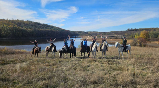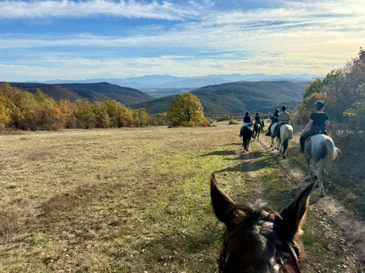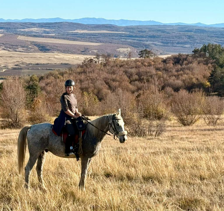 Nach dem Frühstück starten wir kulturell – wir besuchen ein Kloster und eine Höhle. Das Dryanovo-Kloster liegt malerisch in einem engen Flusstal in den Balkanbergen Bulgariens. Es ist von steilen, bewaldeten Felsen umgeben und besteht aus weiss getünchten Gebäuden mit dunklen Holzelementen und roten Dächern. Oberhalb des Klosters befindet sich die „Bacho-Kiro“-Höhle, die in den Fels eingelassen ist und durch ihre grosse ÖƯnung und geschichtsträchtige Atmosphäre auƯällt. Sie ist eine bedeutende archäologische Stätte, in der Spuren früher menschlicher Besiedlung gefunden wurden. Zusammen bilden Kloster und Höhle ein eindrucksvolles Ensemble aus Natur und Geschichte. Danach geht es zu Pferd weiter – wir traben nordwärts, vorbei an endlosen, bunten Feldern und Wiesen, bevor wir uns einem kleinen Canyon nähern, dessen rauschender Bach uns auf unserem Weg begleitet. Wir erreichen das malerische Dorf Kereka, wo wir unter alten Bäumen ein gemütliches Picknick geniessen und die Seele baumeln lassen. Frisch gestärkt setzen wir unseren Ritt fort und sind noch einige Kilometer unterwegs bis wir unser Ziel erreichen- eine tolle Unterkunft mit köstlichem Abendessen, einem einladenden Whirlpool und einer entspannenden Sauna – der perfekte Abschluss für einen fünfstündigen Ritt voller Natur, Freiheit und Abenteuer.