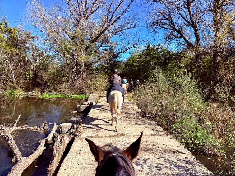 Am nächsten Morgen ist die Aufregung greifbar: Heute lernen wir unsere Pferde kennen. Mein vierbeiniger Partner für die Woche wird mir nach ein paar Fragen direkt zugeteilt – Yanko, das perfekte Trailpferd. Trittsicher, gelassen und trotzdem voller Eifer dabei und immer für einen flotten Galopp zu haben. Ich darf ihn gebisslos reiten, für mich eine neue Erfahrung, hat aber super geklappt. Unsere Gruppe besteht aus sieben Reiterinnen– eine bunte Mischung aus Deutschland, Frankreich, Spanien, England, den USA und Kanada. Verschiedene Sprachen, verschiedene Reitweisen – und doch verbindet uns sofort dasselbe Gefühl: die Liebe zu Pferden, zur Natur und zum Abenteuer.
