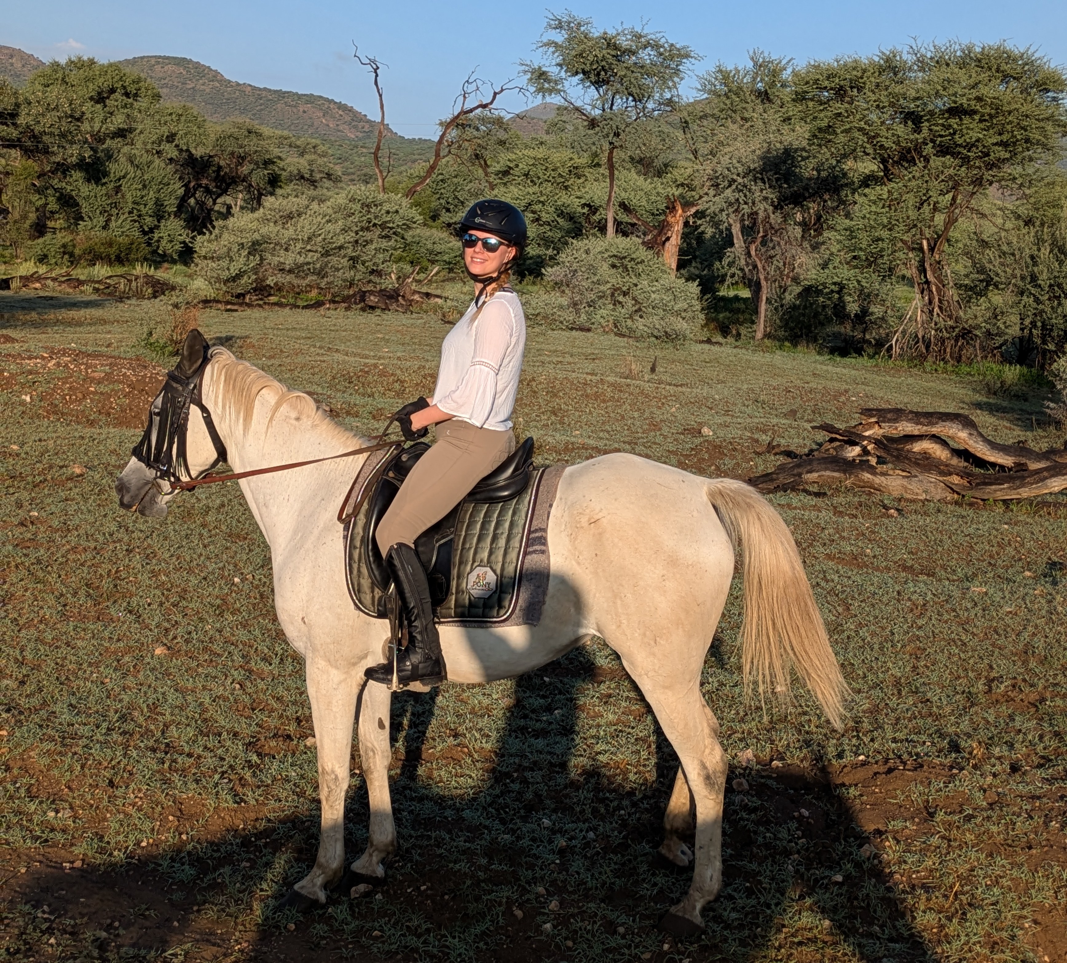 Gegen sieben Uhr morgens stehe ich bereit und helfe noch beim Satteln der Pferde. Mir wird die Stute Zoe zugewiesen, ein kleiner Morgenmuffel. Es geht los Richtung Flussbett in einem gemütlichen Schritt. Schon bald können wir die erste Streifengnu Herde sehen, welche in den Morgenstunden entlang des Flusses weilt. Nun ist auch mein Pferd Zoe wach geworden, sie mag die Gnus gerne. Im Anschluss gibt es einen schönen Sandweg zum Galoppieren. Wir erblicken noch weitere Wildtiere während es langsam immer heisser wird. Meine Freundin, die nicht reitet, hat die morgendliche Frische auch genutzt und die vielen Wanderwege im Gelände erkundet. Wir kehren nach eineinhalb Stunden zurück zur Lodge und es erwartet uns ein reichhaltiges Frühstücksbuffet. Im Anschluss entspannen wir am Pool, keine Wolke ist am Himmel zu sehen, die perfekte Winterflucht.