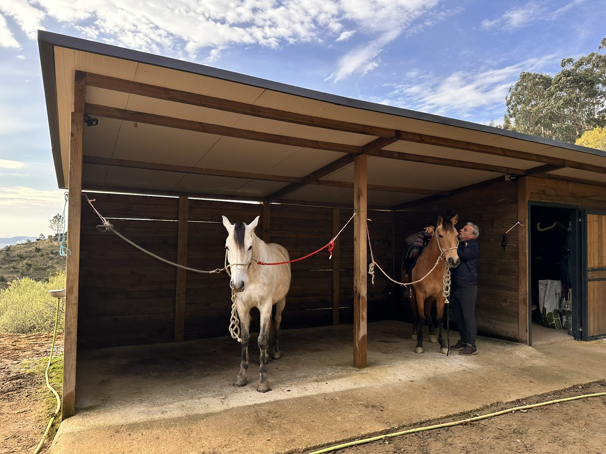 Nach dem Frühstück gehe ich hinunter zum Reitstall. Dort werde ich von Guide Pedro und 7 Lusitanos empfangen, die gerade ihr Kraftfutter fressen und entspannt auf dem Gelände herumstehen. Im Unterstand sattelt Pedro gerade unsere beiden Pferde: Pirata, ein wacher Araber-Lusitano und den frechen Spirit. Die Pferde sind immer in der Herde zusammen. Auf dem grossen Paddock stehen ihnen einige Heuballen zur freien Verfügung. Wenn sie keine Trails machen, dürfen sie sogar auf dem ganzen Gelände frei herumlaufen. Das macht sie zu besonders nervenstarken und trittsicheren Trailpferden. Ausserdem sorgt es für eine gute Gruppendynamik. Gesattelt wird bei Pedro traditionell Portugiesisch. Er möchte, dass die Gäste ein Gefühl für die Reitweise der alten Tage bekommen. Die Arbeitsreitsättel sind alle mit einer Picknickdecke ausgestattet und besonders bequem für lange Ritte. Als ich Platz nehme, fühle ich mich direkt wohl.