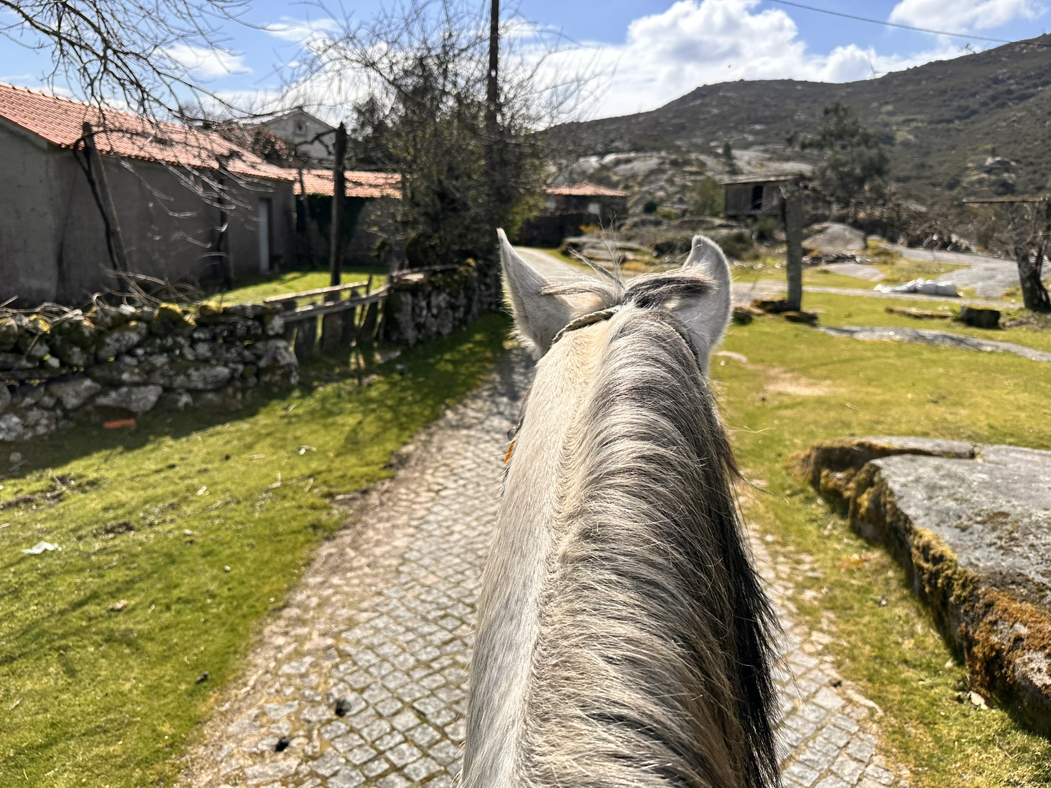 Der 6-tägige Trail für unsere Gäste verläuft auf vielfältigen Pfaden durch die Berge der Serra d`Arga. Ich sehe aus der Ferne die Klöster und Bergdörfer, die als Ziel für die anstehenden Tagesetappen vorgesehen sind. Teilweise bleiben die Pferde vor Ort, während die Gäste am späten Nachmittag zurück zu ihrem Tiny House gebracht werden: Trailreiten ohne Kofferpacken. Die Pferde empfinde ich als sehr zuverlässig und freundlich. Man merkt ihnen an, dass sie das Glück haben neben dem Job als Tourenpferd, ihre Freizeit frei in der Herde verbringen zu dürfen. Unser Guide Pedro hat ein umfangreiches Wissen zu der Umgebung und ein gutes Auge für seine Pferde. Ich habe die Zeit in der Serra d`Arga sehr genossen und kann diesen Geheimtipp in den Bergen Portugals wärmstens empfehlen.